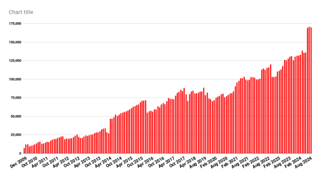 However, the total land area went down, by the equivalent of 738 standard regions. All of that drop — and then some — is accounted for by the fact that a single grid, CandM World, didn’t report its stats this month. Last month, it had over 1,800 regions. Today, the website just shows a security error message, so it could just be a configuration error.