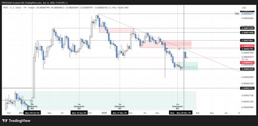 The crypto analyst stated that this would happen if the PEPE price pumps into the January 15 to February 15 window. He further explained that the meme coin needs to be at the unfinished monthly candle in that time window in order to invalidate this. An invalidation would send PEPE higher first, and then the bottom would be in. If that doesn’t happen, it may have one more hurdle to overcome.Â